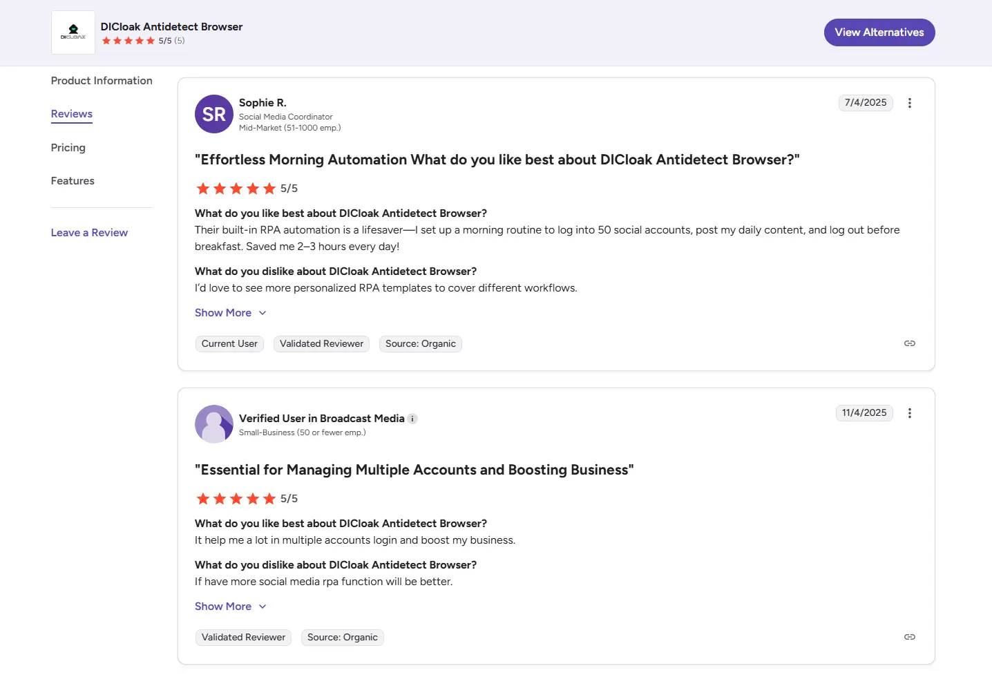 Пользователи DICloak часто отмечают его практический баланс удобства использования и глубины — автоматизация, встроенная в браузер, чёткое управление ролями для команд и стабильное поведение профиля. Положительная обратная связь в G2 и Trustpilot , как правило, акцентирует надежность в долгосрочном управлении аккаунтами и простоту масштабирования операций по сравнению с инструментами с более крутыми кривыми обучения или фрагментированным набором функций.
