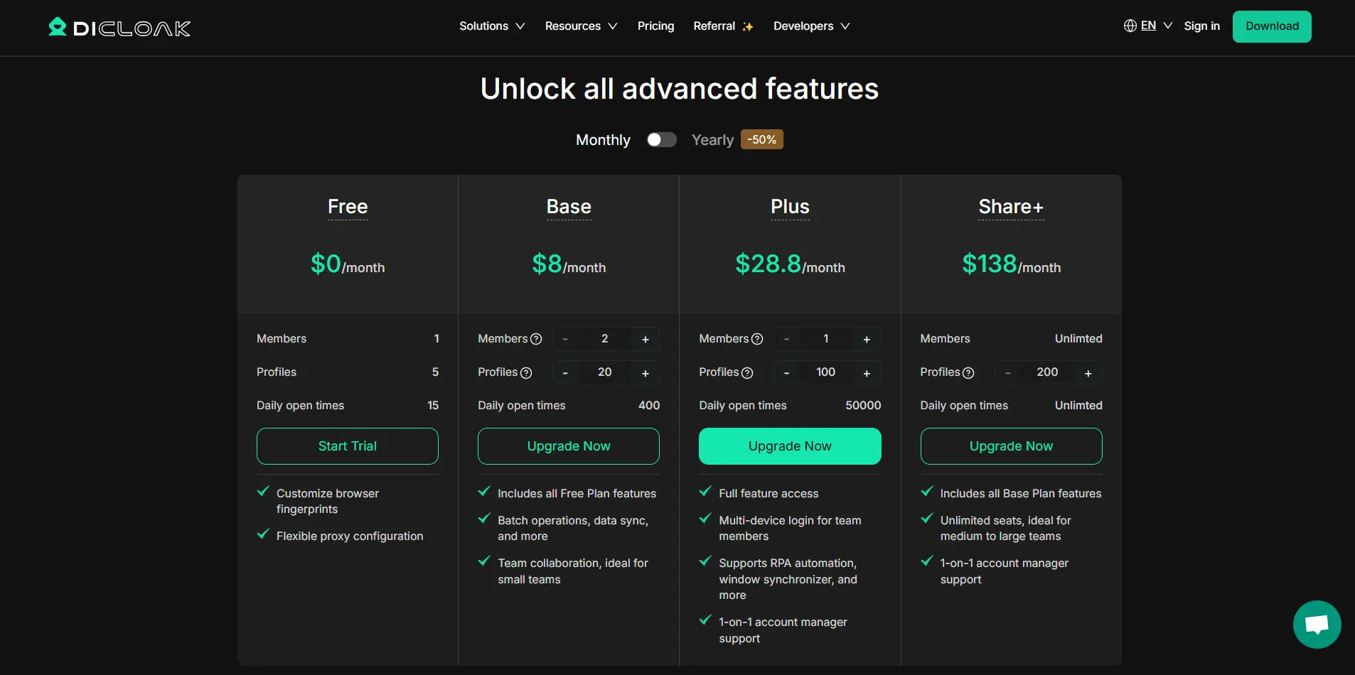 DICloak предлагает пожизненный бесплатный тариф с 5 профилями и конкурентоспособными платными тарифами, включающими автоматизацию, доступ к API и функции команды. Платформа также часто предлагает акции и скидки, что делает её более доступным вариантом для долгосрочного использования.