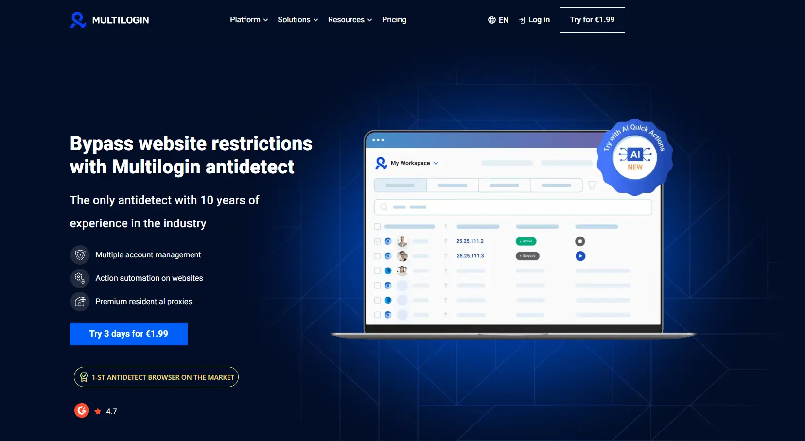 Multilogin — это проверенный антидетектирующий браузер, предназначенный для управления несколькими аккаунтами, защиты конфиденциальности и сценариев гео-обхода. Он часто используется цифровыми маркетологами, партнерскими командами, исследователями и пользователями, которым требуется стабильная изоляция отпечатков пальцев в нескольких онлайн-профилях.