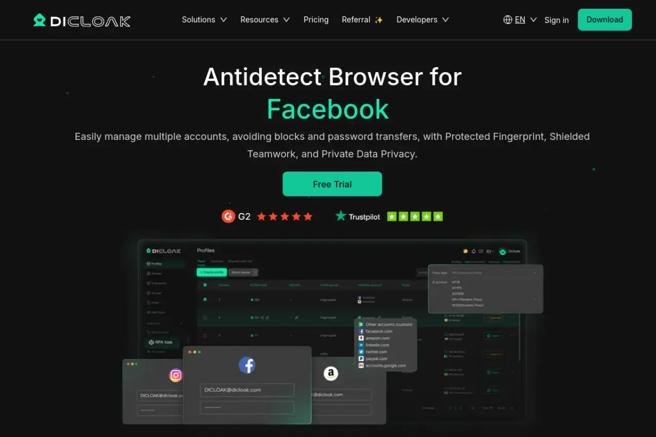 Facebook использует чрезвычайно чувствительные системы обнаружения, которые ищут несоответствия в аппаратном обеспечении вашего устройства и сетевом соединении. Dolphin{anty} давно является фаворитом для этого, потому что был создан специально для медиабайеров, которым нужно управлять сотнями рекламных шкафов. DICloak также является одним из главных претендентов, поскольку интеграция с домашними прокси и симуляция мобильных устройств эффективно скрывают сигналы, которые обычно вызывают мгновенные ограничения рекламных аккаунтов.