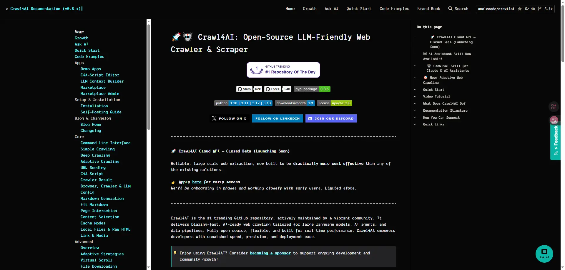 Crawl4AI — хороший выбор для разработчиков и стартапов , которым нужна гибкость в открытом исходном коде. Официальная документация описывает его как открытый, дружественный к LLM-браузеру веб-краулер. Он поддерживает вывод Markdown, извлечение на основе CSS, извлечение на основе LLM и динамические страницы, загружаемые с помощью JavaScript. Это делает его одной из более гибких альтернатив firecrawl для команд, которые хотят контролировать и не против более технической настройки. Например, небольшой стартап в области искусственного интеллекта может использовать Crawl4AI для превращения веб-страниц в чистый контент для поиска или обучения без оплаты закрытой платформы.