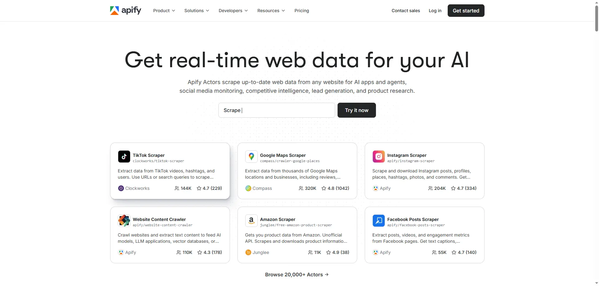 Apify — одна из самых известных альтернатив firecrawl для команд, желающих полноценную платформу для скрапинга. На странице с ценами указано, что пользователи могут запускать инструменты из Apify Store, где некоторые актёры бесплатны, а другие имеют собственную арендную плату. Эта модель маркетплейса полезна, потому что пользователи могут начинать с готовых актёров, а не строить всё с нуля. Это полезно для распространённых задач, таких как скрапинг объявлений в электронной коммерции, результатов Google Maps или социальных данных. Apify хорошо работает для разработчиков, но также полезен для компаний, которые хотят собрать расписание, автоматизацию и готовые рабочие процессы сборки в одном месте.