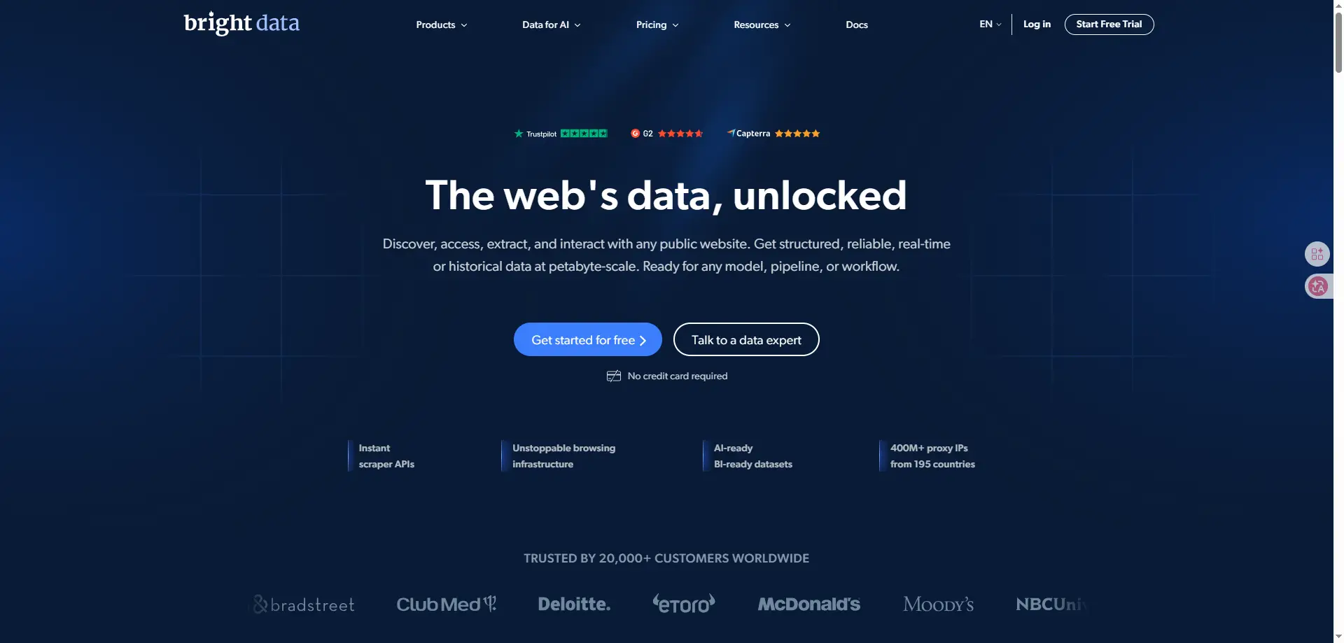 | Яркие данные | API Web Scraper, прокси-сеть, обработка CAPTCHA, рендеринг JavaScript, асинхронная доставка | Нет | Да | В первую очередь API; Примеры, показанные в cURL и общих стеках приложений | Сильная поддержка API и внешней доставки | Основано на использовании; API Web Scraper начинается примерно с $0.001/запись | 4.6/5 |
