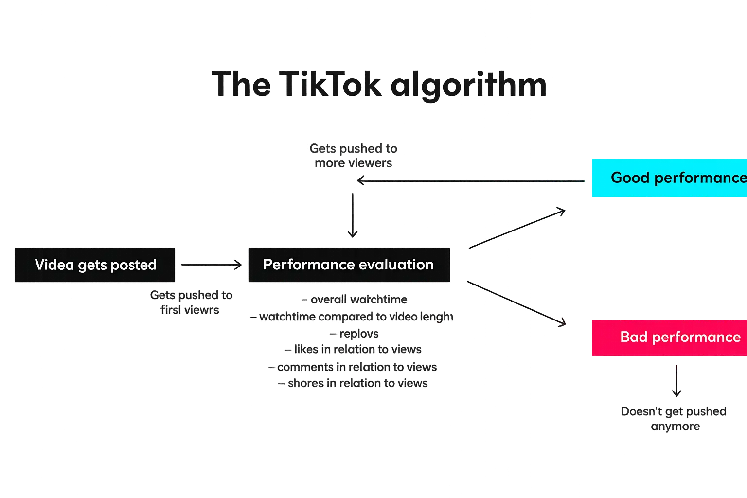 Алгоритм TikTok разработан для того, чтобы показывать пользователям самые релевантные видео. Он использует несколько сигналов, чтобы определить, какие видео следует показывать большему числу людей. Эти сигналы включают количество просмотров, продолжительность просмотра вашего видео и частоту взаимодействия зрителей с вашим контентом.