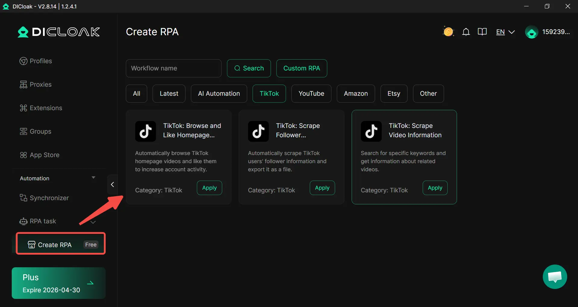 Пользователи, желающие сэкономить время на повторяющейся работе, могут воспользоваться встроенными RPA-инструментами DICloak. Это помогает пользователям эффективнее справляться с повторяющейся поддержкой взаимодействия, особенно когда они управляют множеством аккаунтов или большими объёмами ежедневных задач. Для рабочих процессов TikTok пользователи могут использовать RPA, чтобы сократить ручные шаги, сохранить более последовательные действия и уделять больше внимания качеству контента и стратегии аудитории.