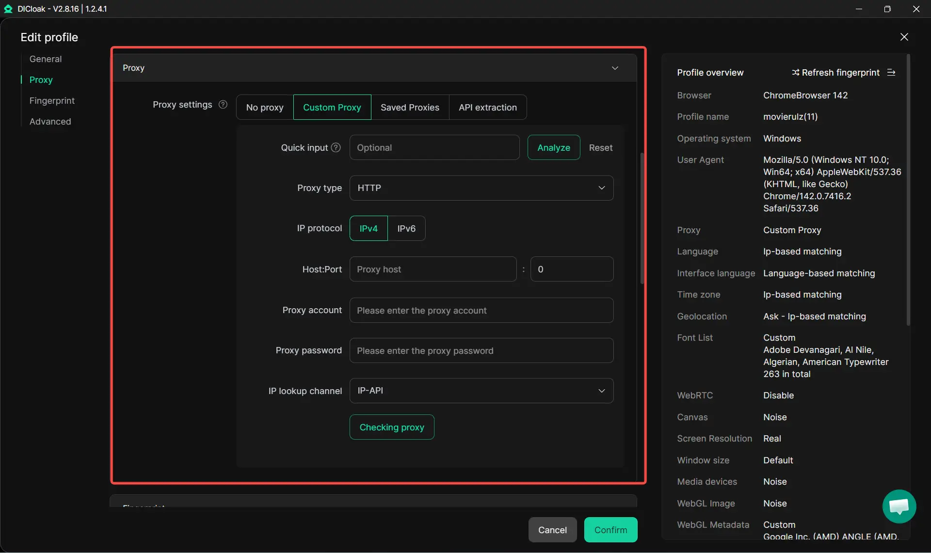 Даже при идеальном отпечатке использование одного и того же IP-адреса на нескольких аккаунтах связывает их. Вам нужны домашние прокси с реальными адресами интернет-провайдера, которым Discord доверяет, географическая согласованность, где местоположение прокси совпадает с вашими куки-файлами и часовым поясом, выделенные IP для каждого аккаунта и мониторинг состояния прокси. Вы можете использовать DICloak для управления купленными прокси. Также вы можете ознакомиться с руководством , чтобы узнать, как пакетно создавать, импортировать, обновлять, тестировать, удалять и экспортировать списки прокси.