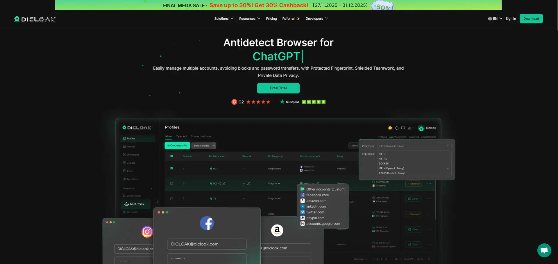 Хотя это не обязательно, настоятельно рекомендуется использовать статический жилой прокси . Это обеспечивает стабильный IP-адрес для вашего общего профиля, предотвращая систему безопасности ChatGPT от выявления вашего аккаунта при входе из нескольких точек. Используя фиксированный прокси, вы снижаете риск принудительного выхода из игры или других проблем с безопасностью. DICloak сотрудничает с сторонними поставщиками прокси-сервисов.
