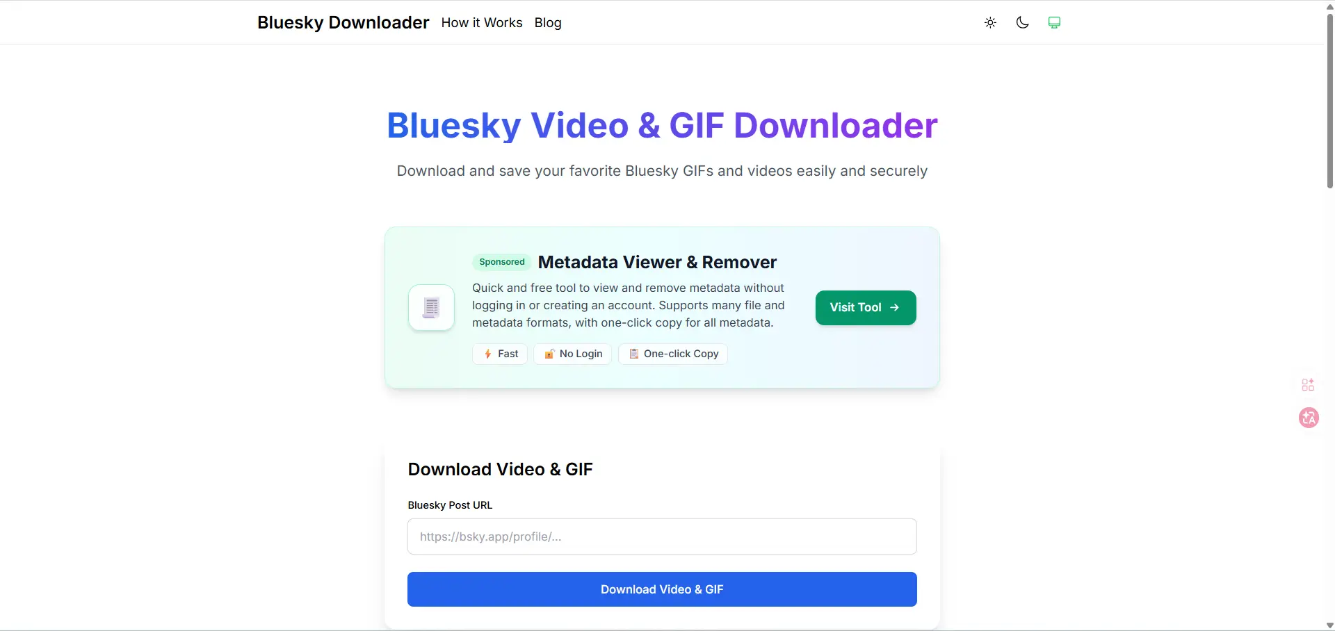 Это веб-загрузчик, поэтому пользователям нужно только вставить URL публикации Bluesky на страницу. Он представляет себя как бесплатный инструмент для скачивания высококачественных MP4-видео, а также предлагает опцию форматирования TS. Для SEO-написания этот инструмент полезен как пример метода «установка не требуется». Это проще для случайных пользователей, особенно тех, кто пользуется общими устройствами или тех, кто не хочет добавлять расширение для браузера.