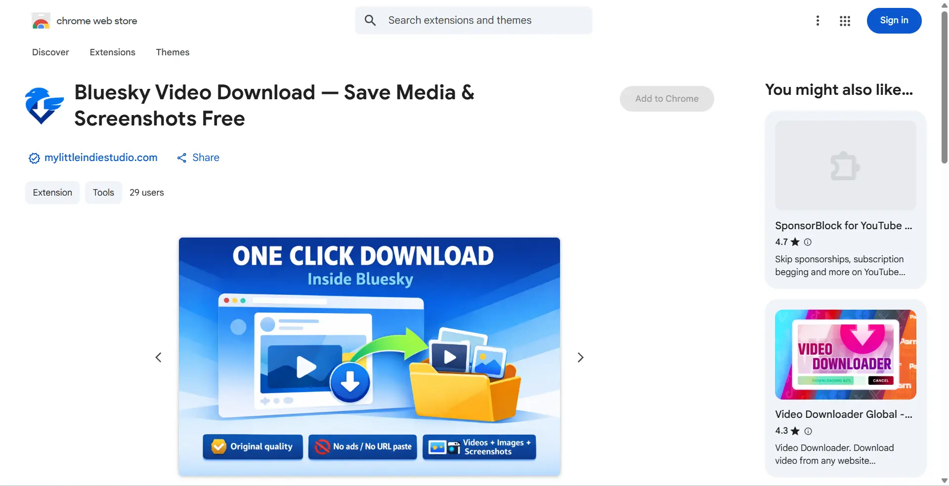 Этот инструмент работает как расширение для Chrome. Его главное преимущество — удобство. Она добавляет поддержку загрузки напрямую внутри Bluesky, так что пользователям не нужно копировать и вставлять ссылки на отдельный сайт каждый раз. Также он продвигает дополнительные функции, такие как сохранение изображений и массовых медиа, что может понравиться пользователям, часто сохраняющим контент. Такой инструмент подходит для пользователей настольных компьютеров, которые хотят быстрее скачивать видеофайлы Bluesky во время серфинга.