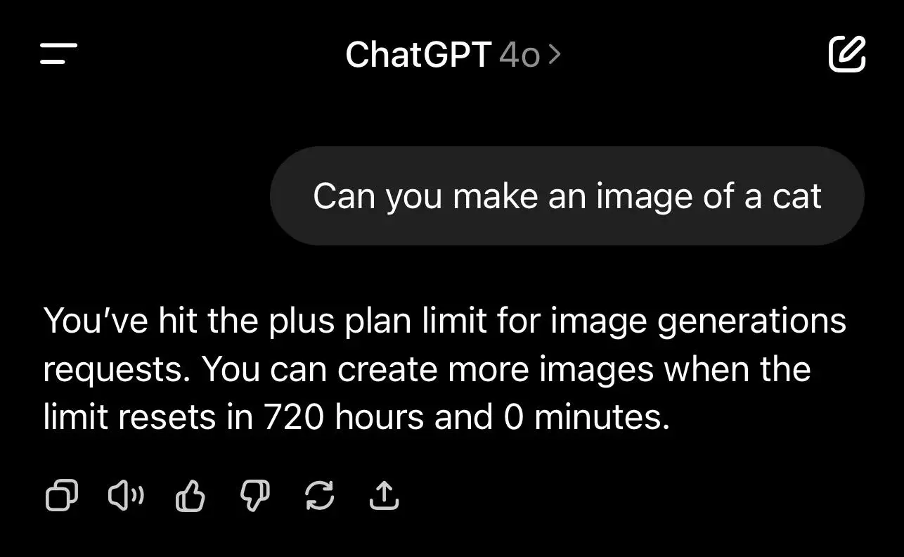 Редактирование тоже важно. ChatGPT может создавать и редактировать изображения, поэтому повторные правки могут использовать вашу ёмкость изображения быстрее, чем ожидалось. Ограничение касается не только количества финальных изображений, которые вы сохраняете. Это также вопрос того, сколько действий с изображением вы используете в процессе.