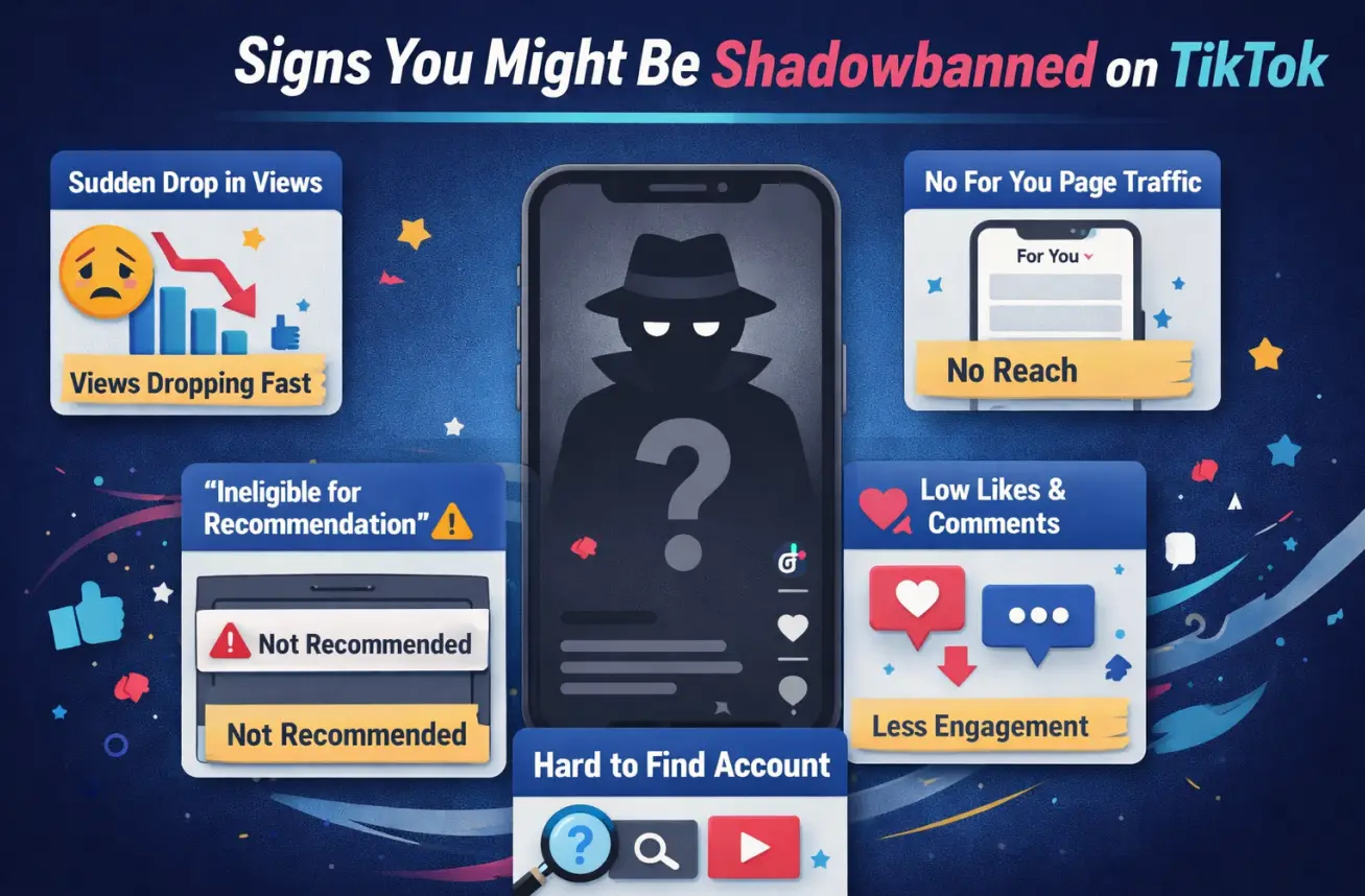 Распространённые признаки включают резкое снижение просмотров, мало или отсутствует трафик на страницу «Для вас», снижение вовлечённости и сообщение о том, что ваш контент не подходит для рекомендации. Если ваши видео становится сложнее найти в поиске, ваш аккаунт может быть заблокирован.