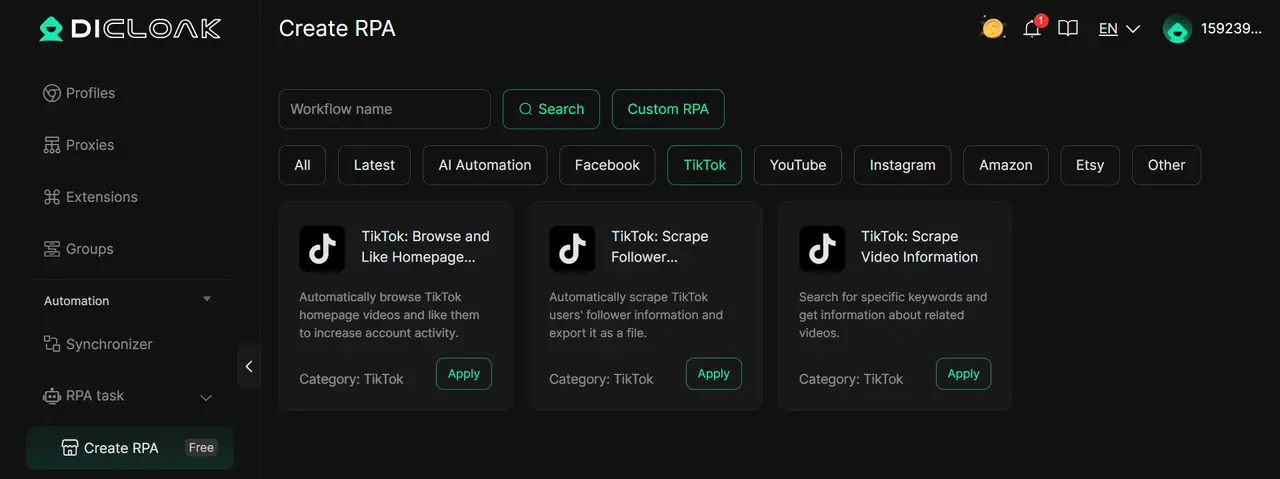 Кроме того, вы можете поддерживать свои аккаунты активными и вовлечёнными с помощью встроенных инструментов автоматизации DICloak. Опишите задачи простым языком, и RPA DICloak автоматически справляется с повторяющимися действиями.