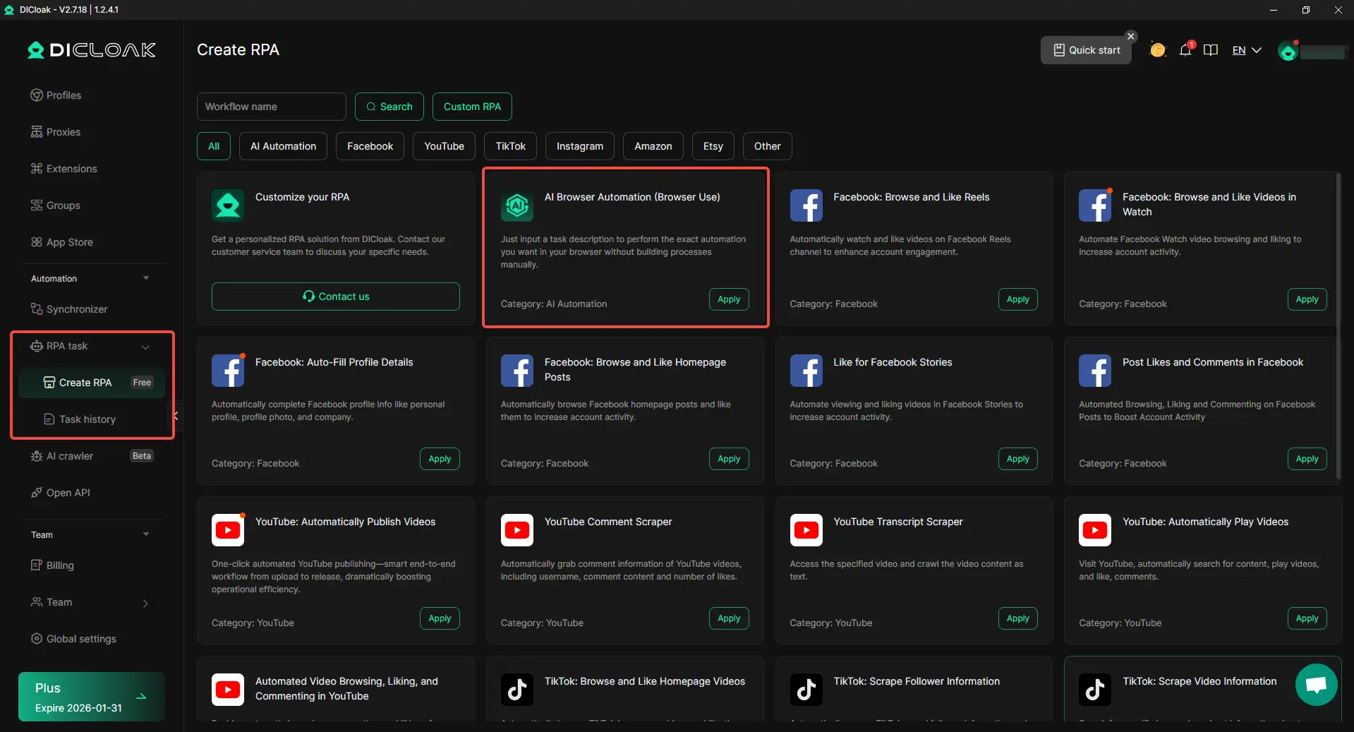 DICloak — это всемирно популярный инструмент управления несколькими аккаунтами, который предлагает уникальные преимущества для профессионалов в таких областях, как управление социальными сетями и электронная коммерция. С помощью DICloak вы можете эффективно и надёжно управлять несколькими аккаунтами на одном устройстве, обеспечивая безопасность аккаунта и снижая риск банов. Вот несколько ярких моментов DICloak:
