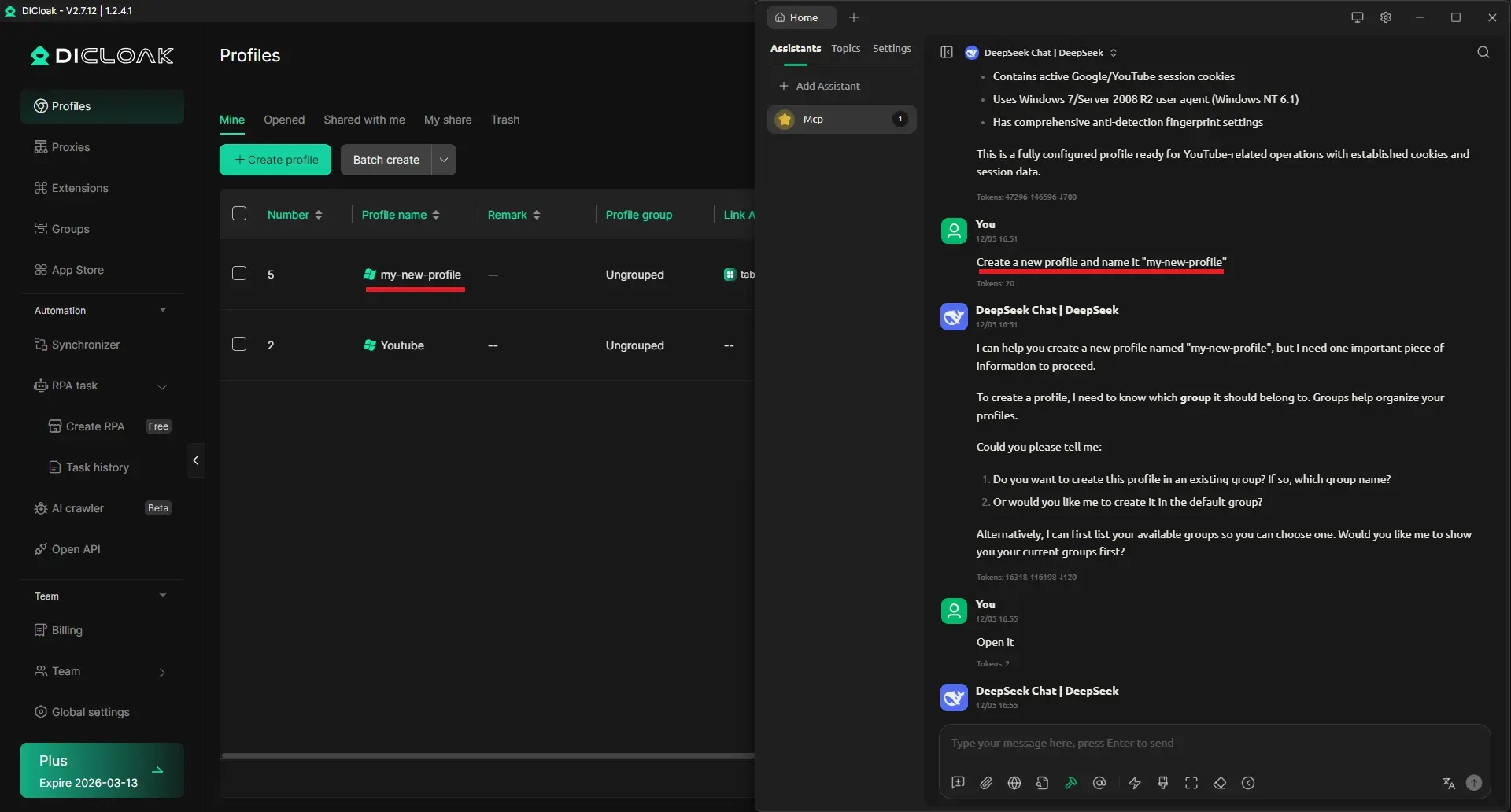 Браузер DICloak теперь поддерживает MCP (Model Context Protocol), что позволяет инструментам ИИ, таким как ChatGPT или Claude, бесшовно подключаться к DICloak. С помощью MCP вы можете автоматизировать многопрофильные рабочие процессы, управлять аккаунтами в социальных сетях, управлять прокси и управлять правами участников — всё это из единого централизованного интерфейса. Такая интеграция упрощает повторяющиеся задачи, обеспечивает последовательную работу и повышает общую эффективность для разработчиков, пользователей ИИ и менеджеров социальных сетей.