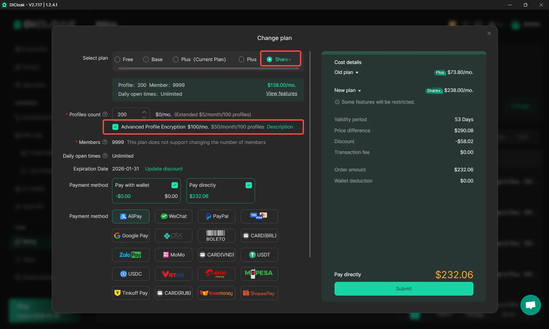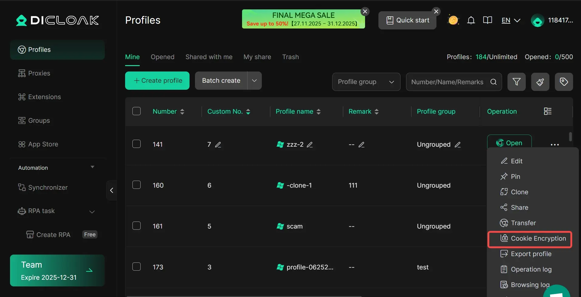 [Поделиться+] Пользователи плана могут вручную шифровать существующие профили через меню редактирования, а новые профили автоматически шифруют куки, отмеченные значком замка. Комиссии за расширенное шифрование зависят от количества профилей.