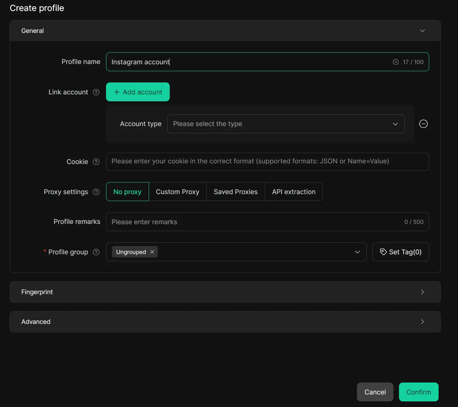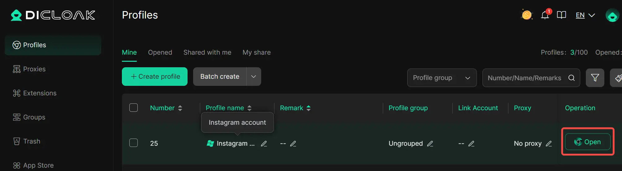 DICloak работает, оснащая каждый аккаунт Instagram уникальным идентификатором браузера, имитируя вход с разного оборудования. Нажмите «Создать профиль», чтобы настроить новый профиль браузера специально для вашего Instagram. Дайте ему чёткое название, например «аккаунт в Instagram», персонализируйте его отпечаток и настройте прокси для повышения конфиденциальности и безопасности.